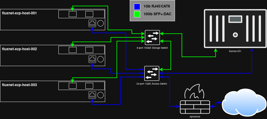 Let’s start by describing the environment and why it was designed this way. In a production environment, it would be ideal to strive for redundancy and fault tolerance at every layer, but that is not always feasible depending on many factors. Redundancy can include multiple physical hosts, dual storage controllers and RAID arrays, firewall HA with CARP, LACP internal network links and redundant switches, redundant carrier links, and so on. The most obvious thing preventing redundancy at every layer is cost. Extra physical hosts, network switches, storage controllers, and so on can raise the design cost of an environment by double, if not more. Another element is simply the added complexity that needs to be mitigated by skilled admins and engineers, both in design, management, and maintenance, which again adds to cost. There is a lot of similarity between the production and the lab environments. Both use a single firewall, a single core/access switch and a single storage switch, among other things. Redundancy at these layers /could/ be built in, but I chose this because of the reduced complexity, simpler management, and they can be easily replaced with minimal downtime. If 99.9999% uptime is not required, there is no point in pulling your hair out over it. Literally all of IT is built up like a house of cards, and the balancing act of knowing where to invest time, effort, and money comes down to experience and a bit of luck.