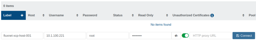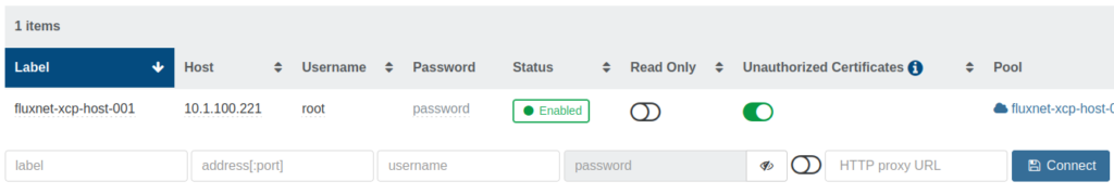 Enter label, username (root), password, and enable Unauthorized Certificates. Click ‘Connect’.