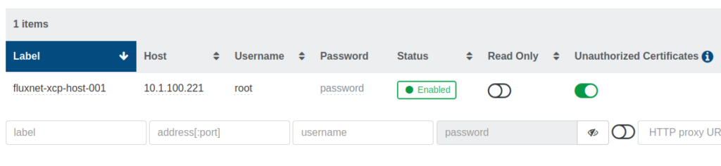 If everything is correct, and XO is able to connect to the host, it will be added to the list with a green ‘Enabled’ button. This button can be useful later if you ever need to force a disconnect/reconnect from XO to a host/pool master.