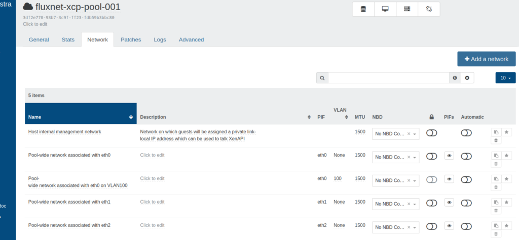 Quick note: The networks with names like ‘Pool-wide network associated with’ can be viewed like switch trunks. One is automatically created with each PIF. These do not add VLAN tags, so any VM with these networks assigned will also need to provide their own tags. However, if that VLAN is assigned as PVID on the switch port just beyond the PIF on the host, the switch port will handle adding the VLAN tag for any VMs that are assigned this network. Other VLAN networks can be created on that PIF as long as they are also allowed tagged at the switch port.