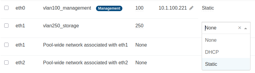 Each row here was either created with the network interface device itself, or created when Networks were defined at the pool level. They are simply either network interface, or network interface with a VLAN tag. Assigning IP configuration here to certain PIFs is very important so that hosts can talk to other hosts, or hosts can talk to storage. The management IP was set during installation, so all that is left here is to set an IP on the storage PIF.