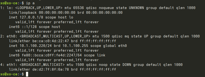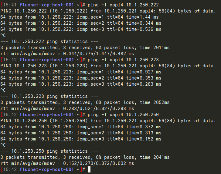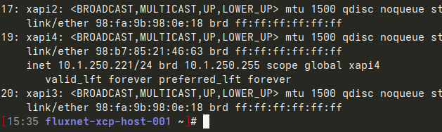 Instead of simply pinging the other hosts, do ‘ip a’ and find that the interface name here is ‘xapi4’.