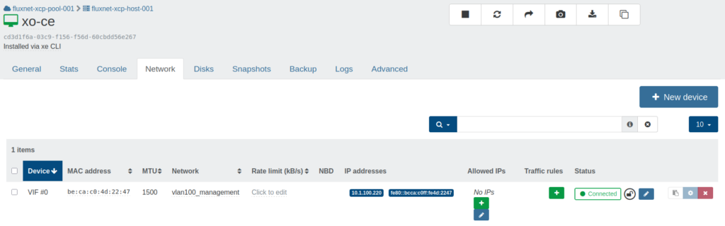 Currently, XO-CE has a VIF with a 1Gb/s link speed, which is more than adequate for basic host management, but less so when it comes time to configure backups. I want to give XO-CE another VIF, this time on the storage VLAN.