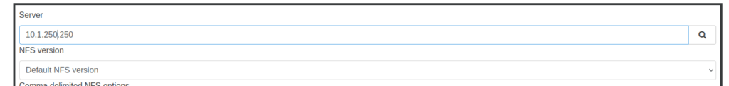 After selecting NFS, the options change in the Settings section. Type in the storage IP, ensuring that it is the one on the storage subnet/VLAN. Click the ๐Ÿ”.