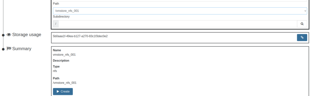 Click the Path drop-down menu and select the appropriate path. Since this path contains an existing SR, that SR UUID is displayed in the ‘Storage usage’ section, and I will not click the create button below. Instead, I will click the blue ‘Reattach SR’ button to the right of the SR UUID.